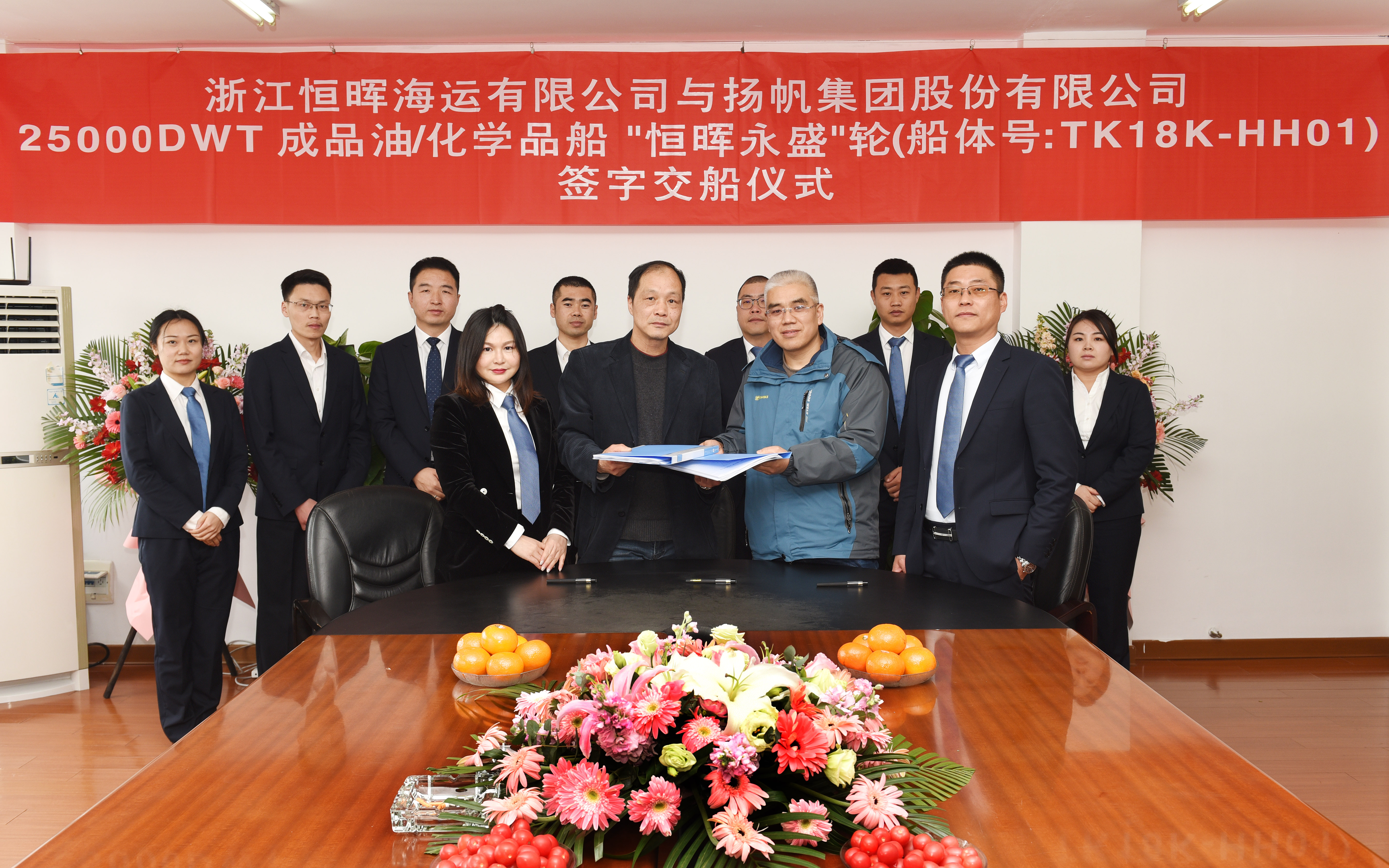 2021年3月24日,由揚(yáng)帆集團(tuán)股份有限公司下屬全資子公司浙江東海岸船業(yè)有限公司為國內(nèi)船東浙江恒暉海運(yùn)有限公司承建的1艘25000噸化學(xué)品油船“恒暉永盛”號正式簽字交付。