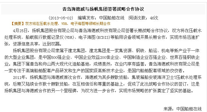 中國船舶在線:青島海德威與揚(yáng)帆集團(tuán)簽署戰(zhàn)略